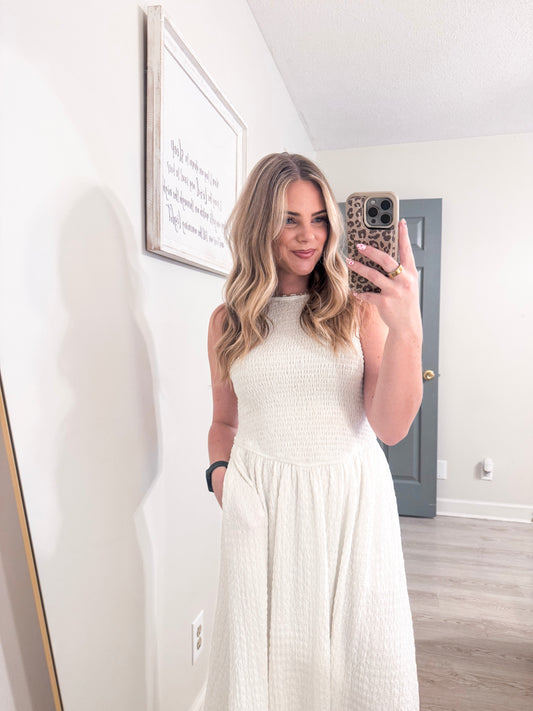TEXTURED SMOCKED SLEEVELESS DRESS